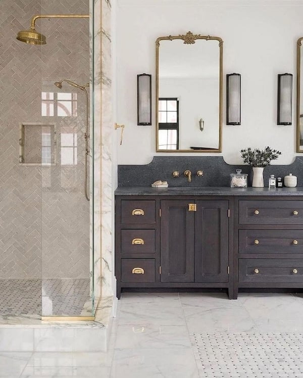 Brass mirrors and sconces, mixed with polished nickel faucets and black pulls and a warm wood vanity cabinet, reflect an elegant and timeless look, making it a perfect example of 2026 master bathroom trends.