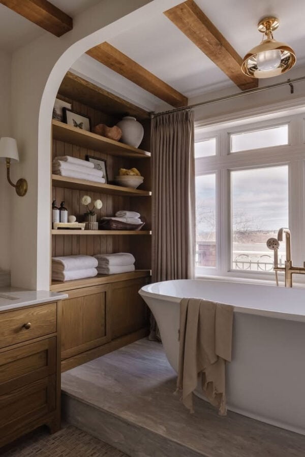 Here’s a timeless bathroom design featuring twin vanities in a light oak wood finish, a freestanding tub, and statement chandelier. I love the elegant look of curtains in the bathroom.