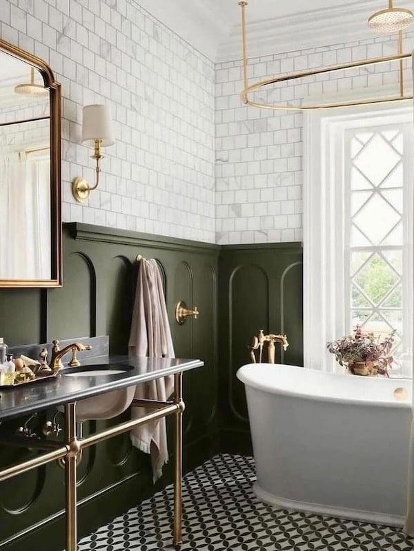 Here’s a great example of small full bathroom trends for 2026, incorporating a bronze faucet and brass mirror, cabinet hardware, and sconces. A gray-green vanity cabinet is always a timeless choice.