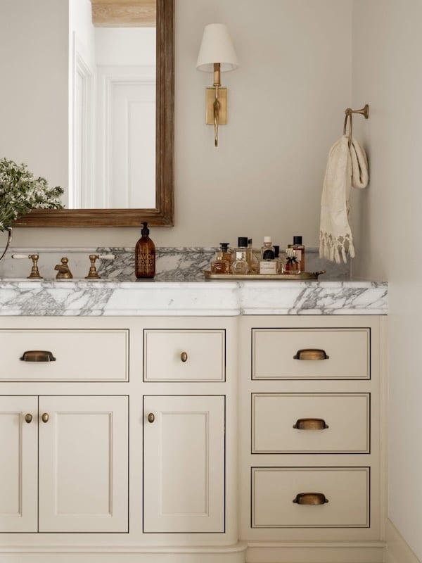 Marble, handmade zellige, or even beige-toned porcelain floor and shower tile add depth and texture to the bathroom.
