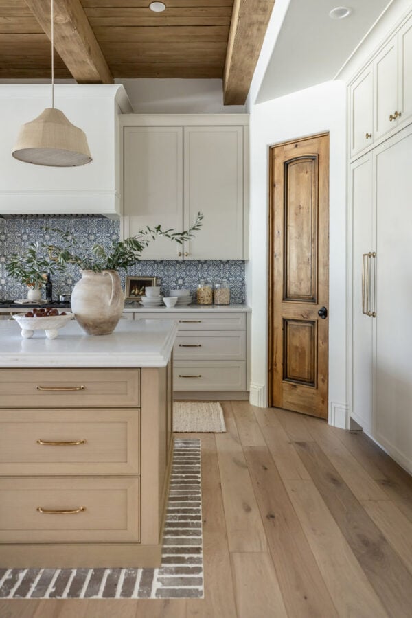 Patterned ceramics and a mix of warm neutral and wood cabinetry add a custom look to this on-trend kitchen design.