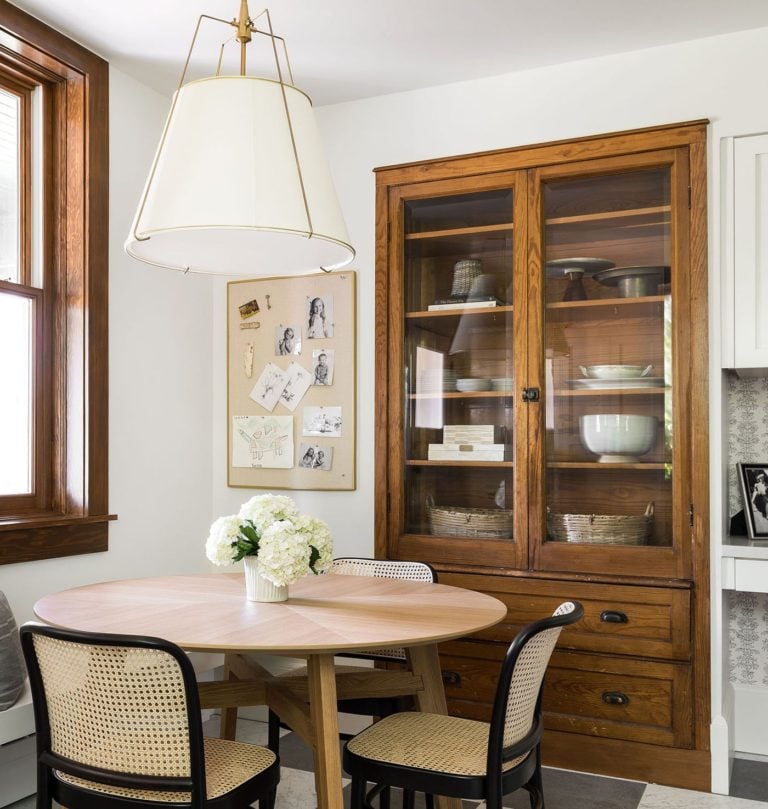 Such a gorgeous corner dining nook! I love the wallpaper and thoughtful details in this cozy space.