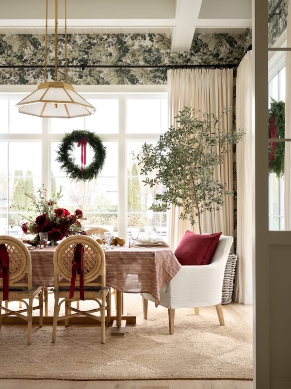 I love how the red velvet ribbon and evergreen sprigs pop against the gorgeous white berries, napkins and china. And that tablecloth is a work of art in itself! From One Kings Lane.