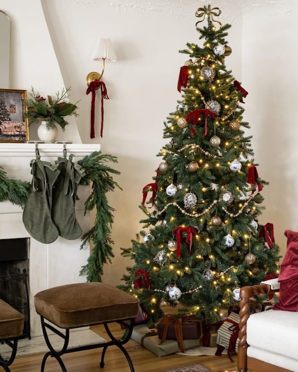 Mix shiny glass ornaments with matte finishes, add velvet or satin bows, and finish with a star or classic finial topper.