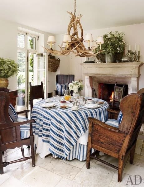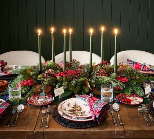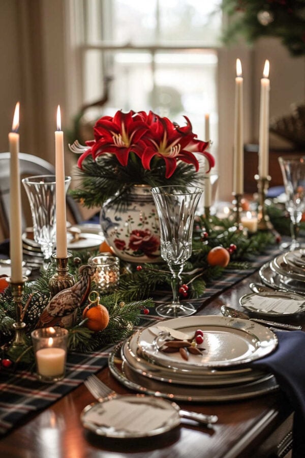 And on the dining table, try a linen tablecloth topped with a plaid runner, silver or brass candlesticks, and crystal glassware.