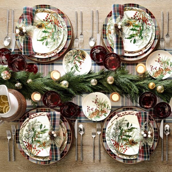 Dinnerware – Plaid Chargers – Plaid Napkins – Table Runner