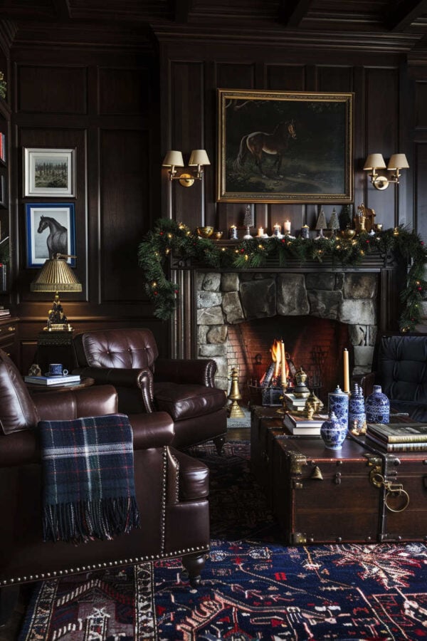 Think leather-bound books, plaid curtains and pillows, riding boots by the door, or an antique-style mirror.