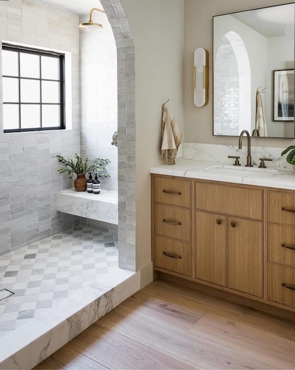 2026 bathroom trends are all about natural materials, including wood vanity cabinets and woven lighting, so I also recommend adding in a few natural elements, as well as interesting textures via rugs, towels, decor, mirrors, window coverings, and light fixtures.