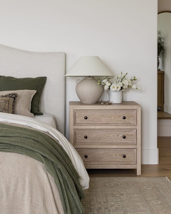 Wood nightstands and a neutral color palette add a touch of organic coastal style to this beautiful bedroom.