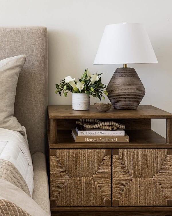 This chic bedroom features an upholstered bed and woven detailing on the nightstand for an organic coastal look.