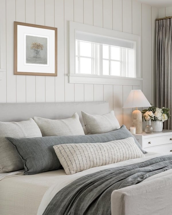 I love the mix of patterns and textures, as well as the paneled shiplap wall treatment, in this beautiful modern coastal style bedroom.