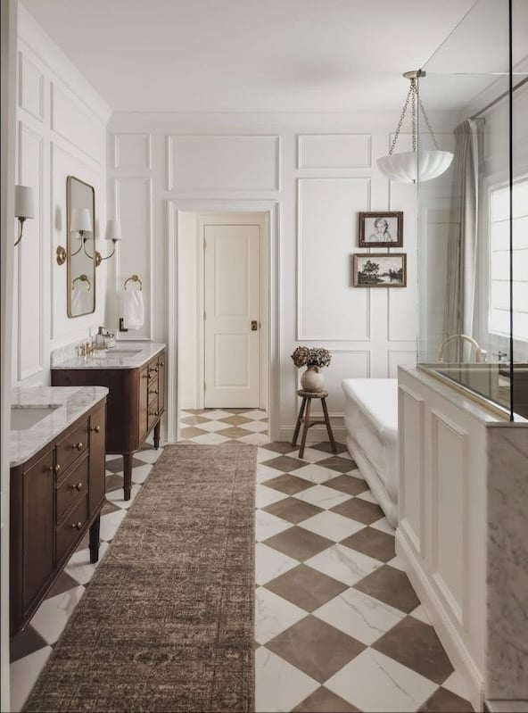 This beautiful primary bathroom features different metals via a polished nickel faucet and brass finishes on the sconces, mirror, and cabinet pulls. Here’s a source for the chandelier.