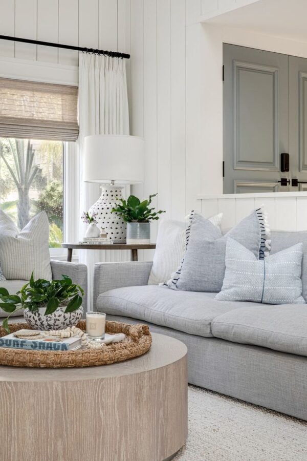 Modern coastal style is a great way to add a casual yet chic look to the living room. Its lighter color palette, breezy aesthetic, and comfortable, relaxed attitude makes coastal style the perfect aesthetic for living rooms and family rooms — in fact, it’s the decorating style I chose for our entire home.