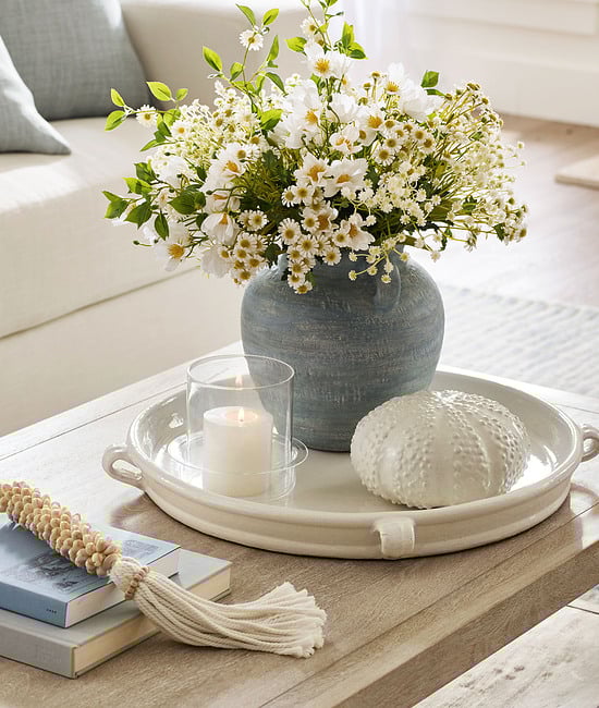 Here’s an elevated coastal living room conversation area, complete with a comfy sectional and tiered coffee table.