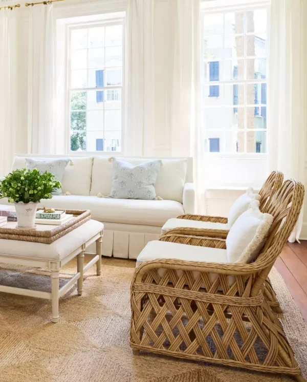 Neutral tones and textures, combined with a subtly-patterned rug, a raffia-covered coffee table, high ceilings, and large windows, bring a touch of beachy coastal style to this living room.