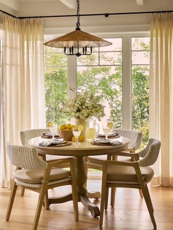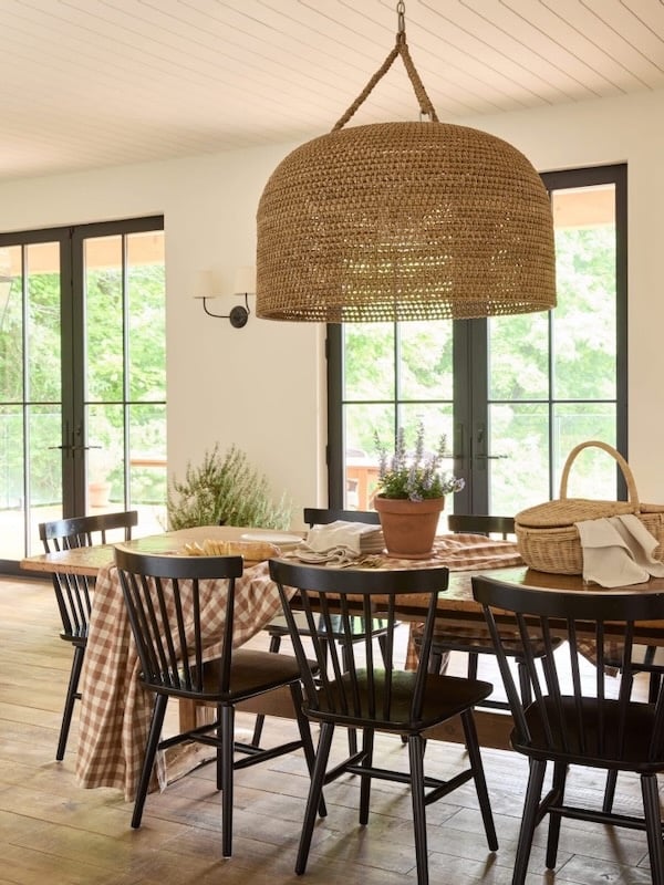 This beautiful dining area from Pure Salt Interiors features a timeless mix of natural textures and warm wood elements. Here’s where to find the woven pendant.