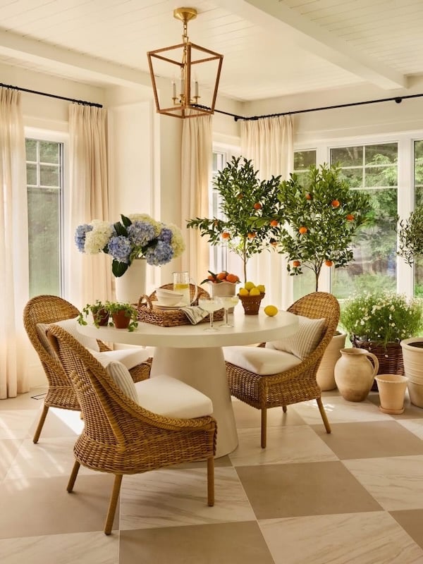 This chic living room and dining room from Bone Made, with its woven pendant lights and curved cane dining chairs, is a great example of dining room trends for 2026. Here are similar cane dining chairs.