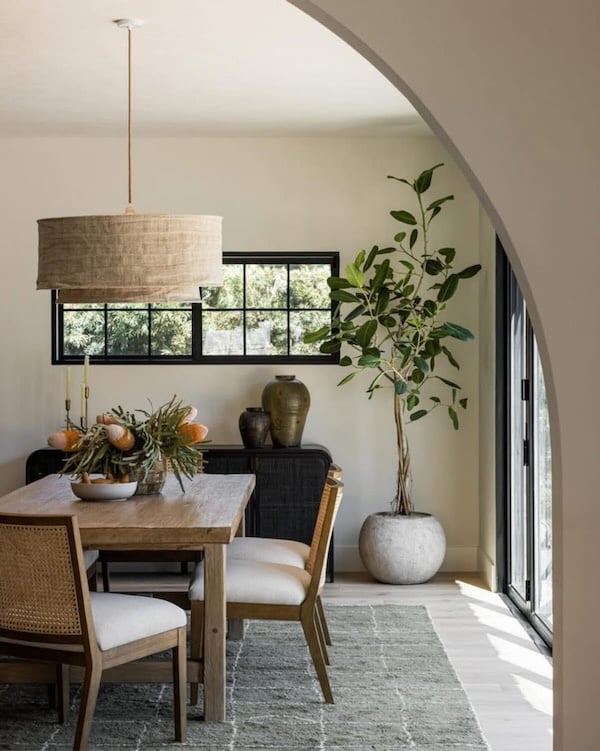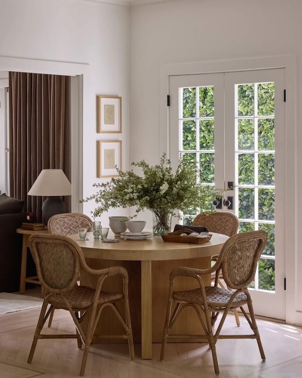 A simple mix of warm wood tones, natural elements, and rattan enhance this organic modern dining area from Pure Salt Interiors.