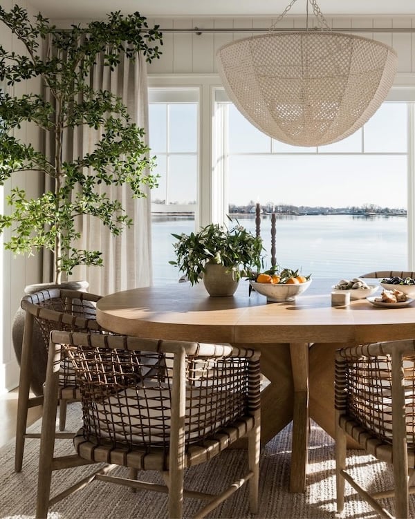 This beautiful modern coastal dining room, from Pure Salt Interiors, features a round wood dining table, wishbone dining chairs, and a statement woven pendant light.