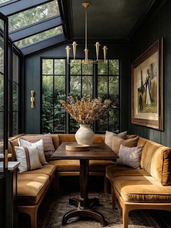 I love the idea of tucking a dining table and banquette into a sun room or small area, as shown in this beautiful space from Vivir Design.