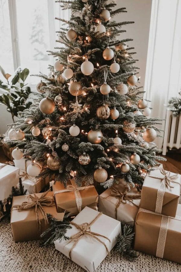 - Neutral wrapped gifts using kraft paper and velvet ribbons in beige, ivory, or gray.