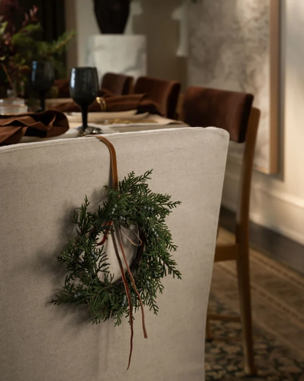 Small wreaths attached to the backs of dining chairs are an easy way to add a neutral holiday touch to your home.