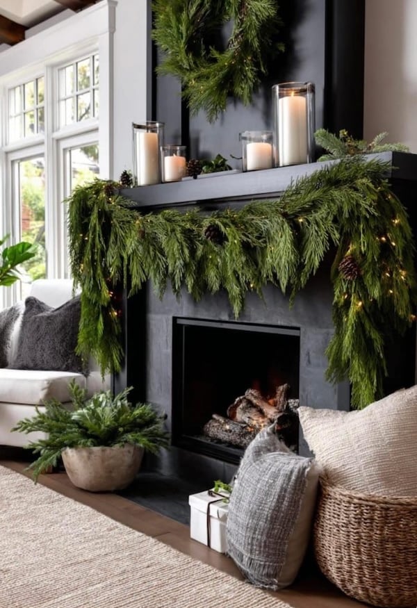Layer faux cedar or pine garlands with eucalyptus or olive branches for variety.