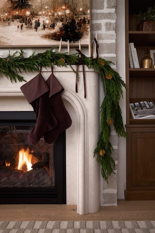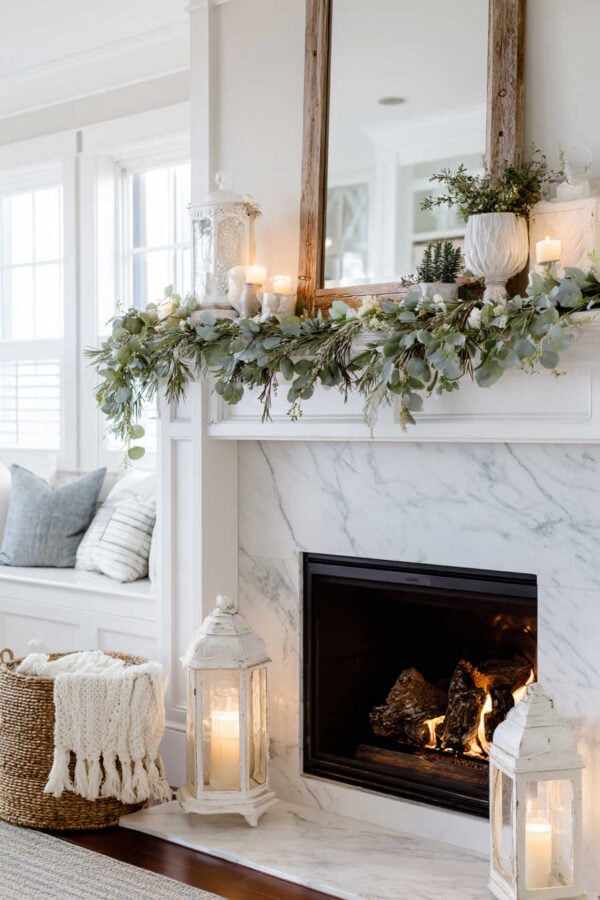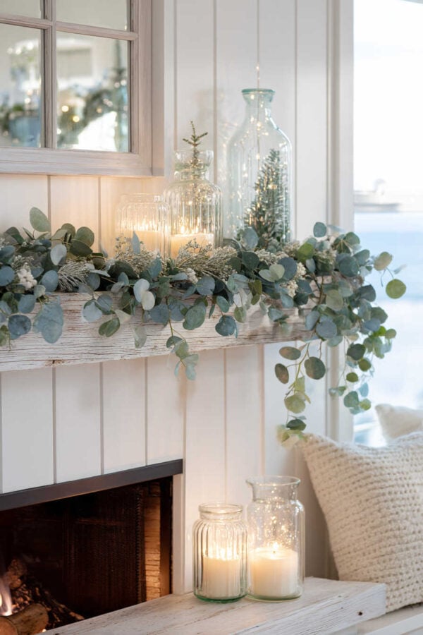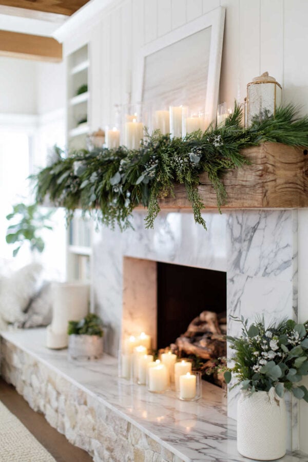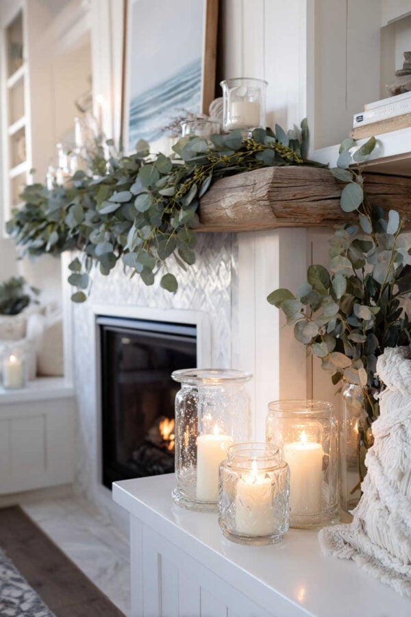 Keep your mantel or shelves minimal and elegant with greenery, candles, and neutral accents.