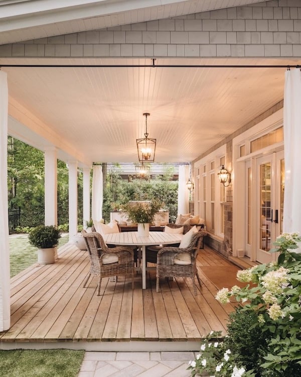 Outdoor curtains, abundant outdoor lighting, and gorgeous landscaping create a stunning outdoor dining and living area on this covered back porch.