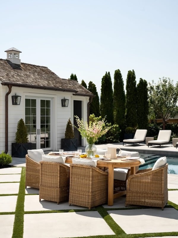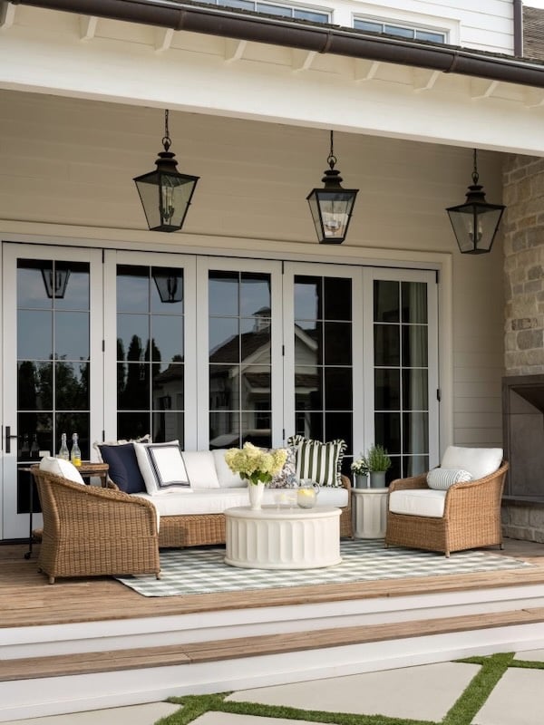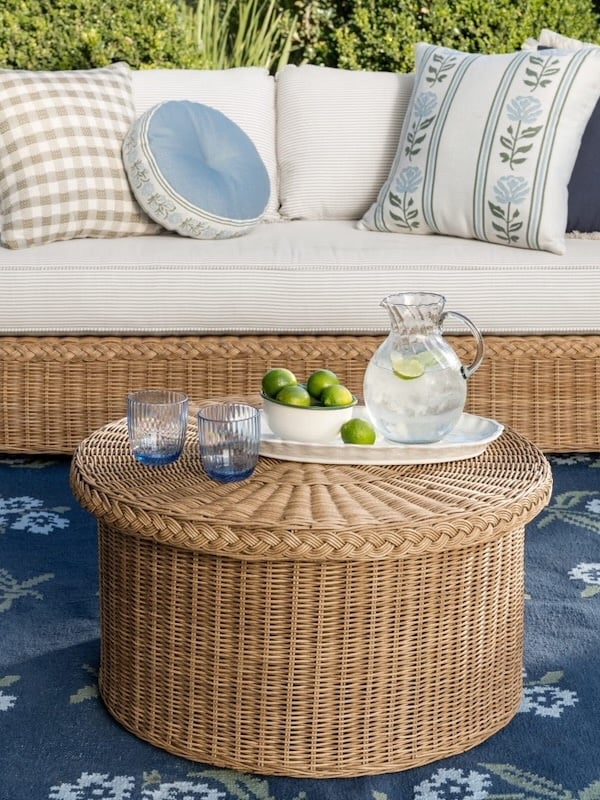 Once your foundational outdoor pieces are in place, you can then layer in budget-friendly pillows, rugs, baskets, string lights, and decorative accessories — all of which can easily be updated when your style changes.