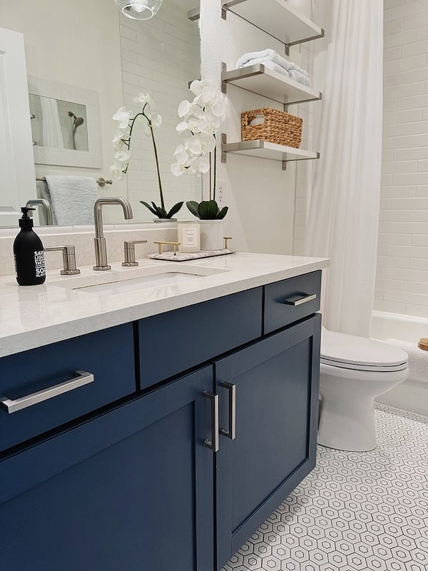 Van Deusen Blue (Benjamin Moore) – bold yet classic with historic charm. I chose Ven Deusen Blue as our guest bathroom vanity color.