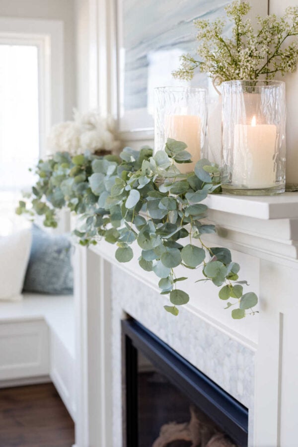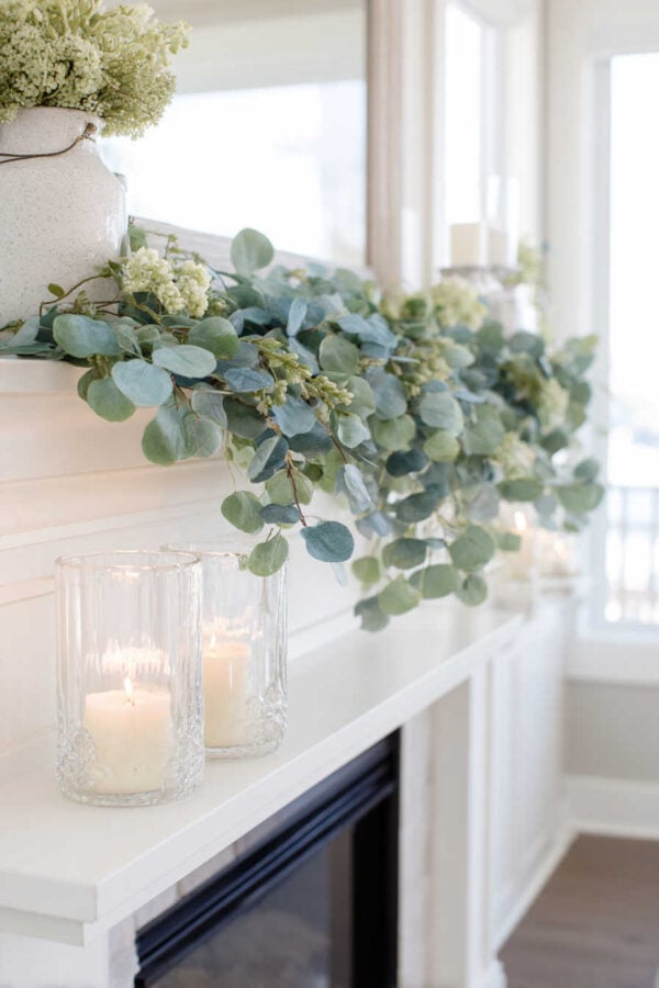 Mixing a mirror with smaller artwork and adding a couple of candle sticks and greenery creates a stylish spring mantel that will look beautiful through summer and into fall.