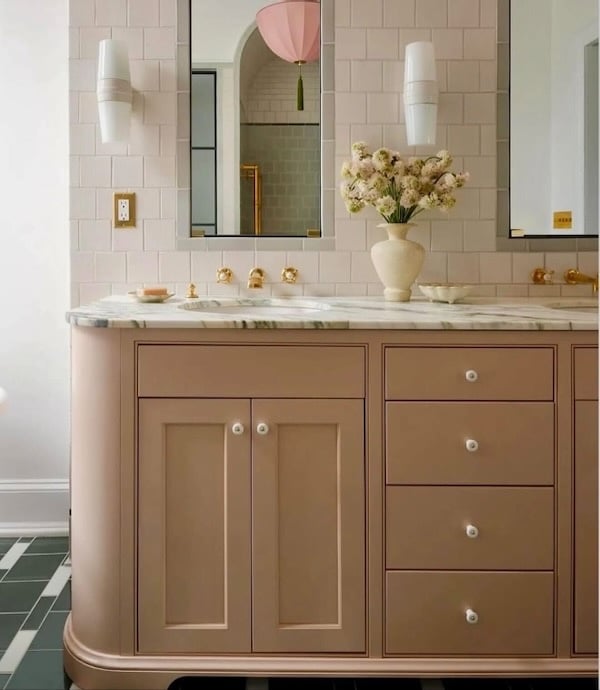 Light pastel hues create a tranquil and inviting space that embraces the essence of spring. I love the warm white and light blush tones in this gorgeous master bathroom: