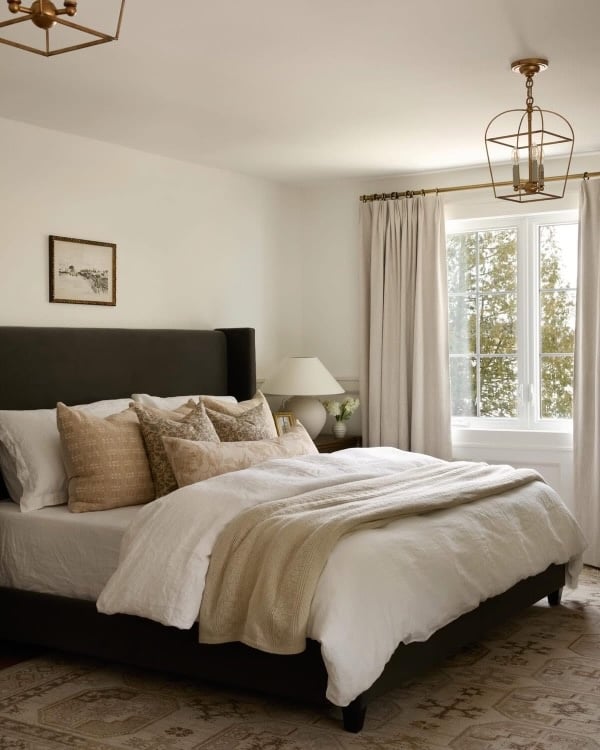 Adding layered bedding in neutral tones is a great way to update your primary or master bedroom for spring while retaining a feeling of coziness, as shown in this beautiful space.