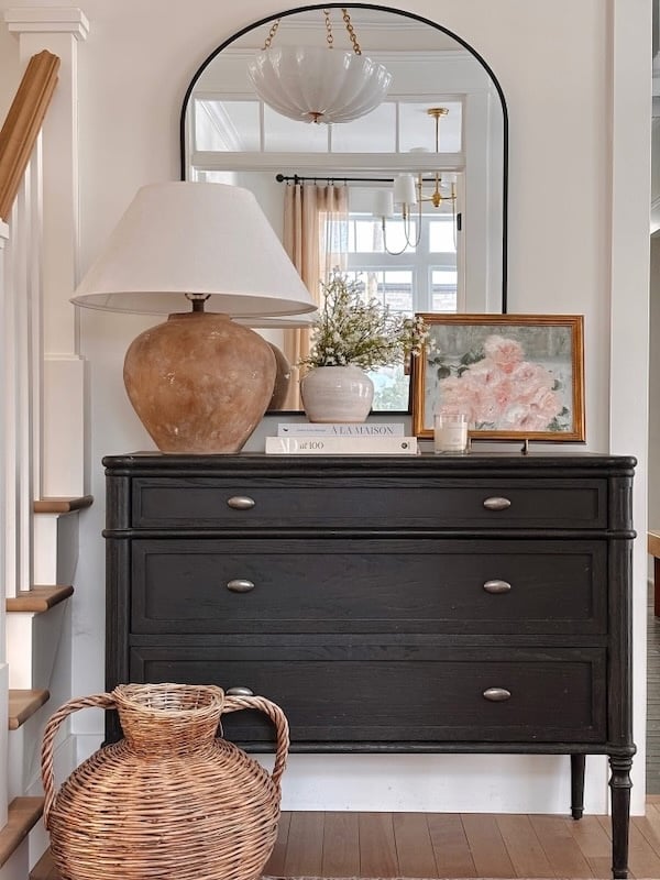 A decorative dresser can be a beautiful addition to your foyer decor — and it has the bonus benefit of extra storage space.