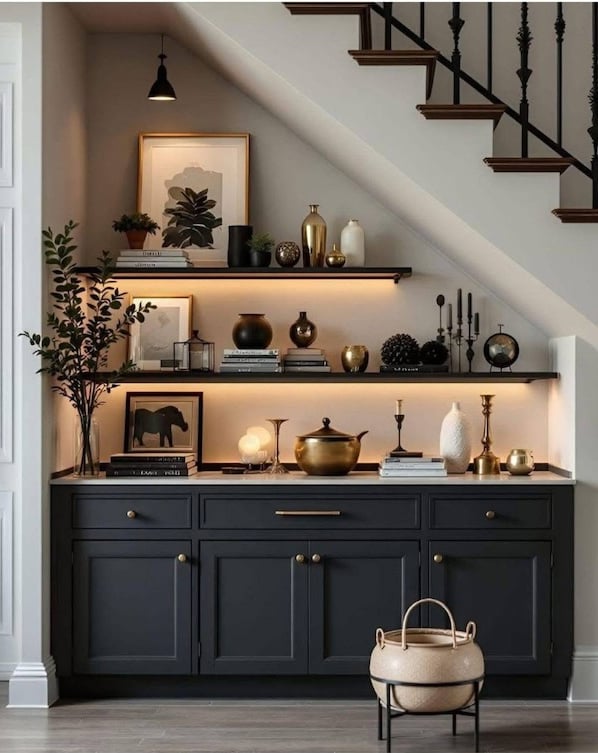 This under-the-stairs nook features warm touches of brass for a modern look.