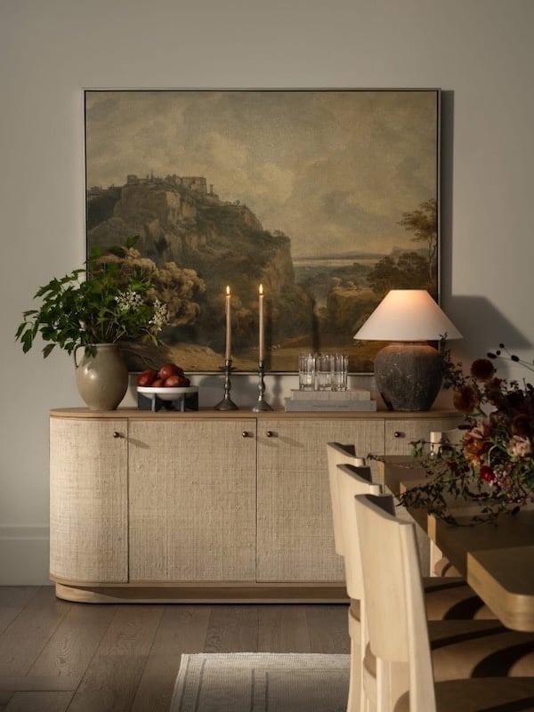 Styling a sideboard or console table with candles, greenery, a bowl of fruit, and warm lighting brings a modern winter touch to your dining room.